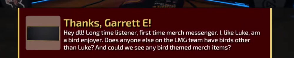 than Luke? And could we see any bird themed merch items? | Timestamp |  |
