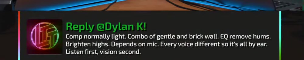 Brighten highs. Depends on mic. Every voice different so it's all by ear.