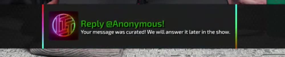 | Anonymous | reply | Reply @Anonymous! Your message was curated! We will answer it later in the show. | Timestamp | ![]() |