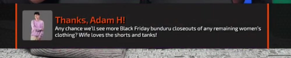 | Adam H | message | Thanks, Adam H! Any chance we'll see more Black Friday bunduru closeouts of any remaining women's clothing? Wife loves the shorts and tanks! | Timestamp | ![]() |