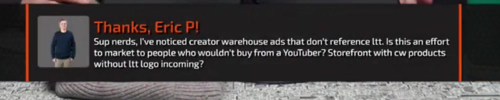 | Eric P | message | Thanks, Eric P! Sup nerds, I've noticed creator warehouse ads that don't reference ltt. Is this an effort to market to people who wouldn't buy from a YouTuber? Storefront with cw products without Itt logo incoming? | Timestamp | ![]() |