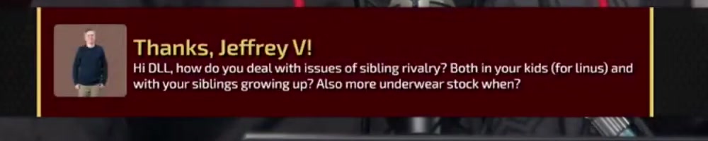 | Jeffrey V | message | Thanks, Jeffrey V! Hi DLL, how do you deal with issues of sibling rivalry? Both in your kids (for linus) and with your siblings growing up? Also more underwear stock when? | Timestamp | ![]() |