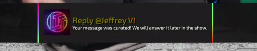 | Jeffrey V | reply | Reply @Jeffrey V! Your message was curated! We will answer it later in the show. | Timestamp | ![]() |