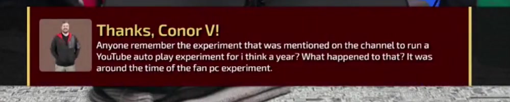 | Conor V | message | Thanks, Conor V! Anyone remember the experiment that was mentioned on the channel to run a YouTube auto play experiment for i think a year? What happened to that? It was around the time of the fan pc experiment. | Timestamp | ![]() |