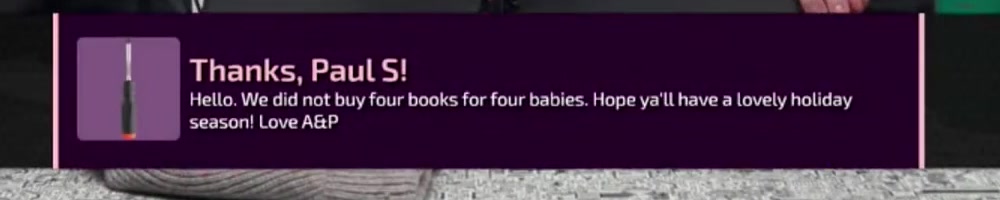 | Paul S | message | Thanks, Paul S! Hello. We did not buy four books for four babies. Hope ya'll have a lovely holiday season! Love A&P | Timestamp | ![]() |