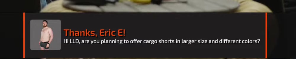Hi LLD, are you planning to offer cargo shorts in larger size and different colors? | Timestamp |  |