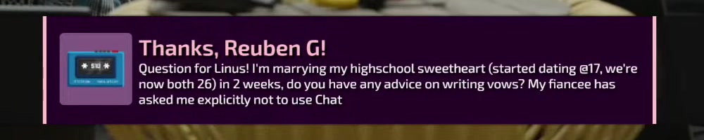 Question for Linus! I'm marrying my highschool sweetheart (started dating @17, we're